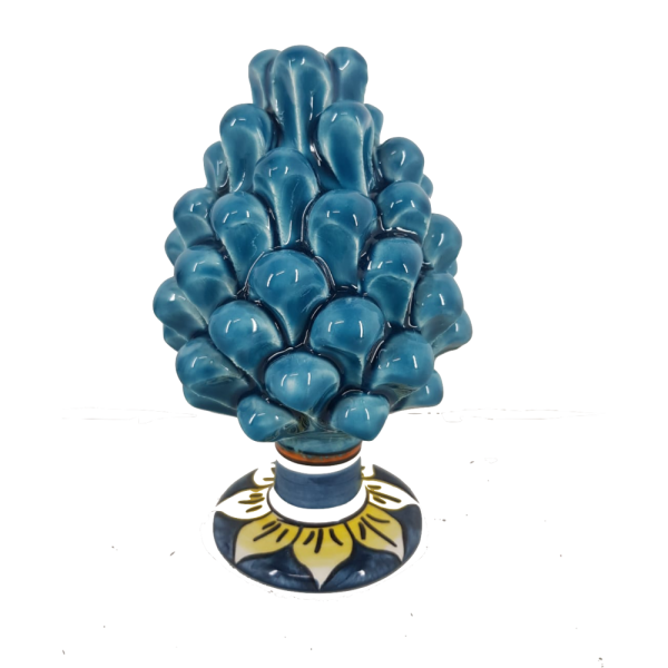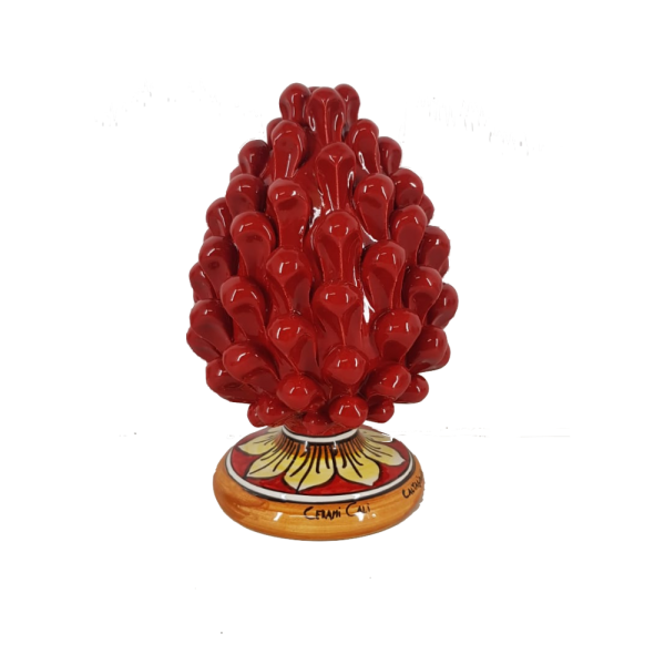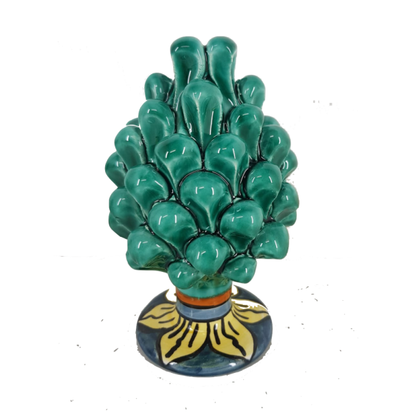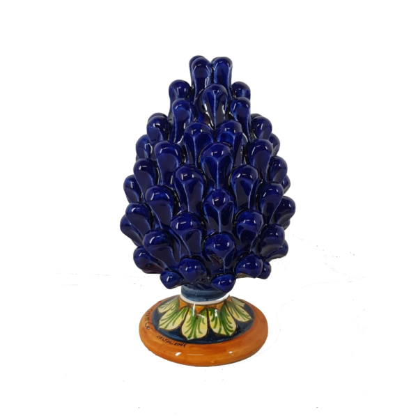 Questa pigna è forgiata unicamente con l’ausilio del tornio e rifinita con picciuoli applicati a mano; decorata con colori a base di materie prime presenti in natura e cotta due volte a 1000 gradi.
